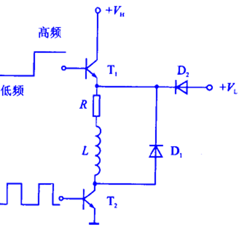 ![]() 步進(jìn)電動(dòng)機(jī)單電壓驅(qū)動(dòng)電路 2、雙電壓驅(qū)動(dòng) 1) 雙電壓法:在低頻段使用較低的電壓驅(qū)動(dòng),在高頻段使用較高的電壓驅(qū)動(dòng) 低頻:給T1低電平?關(guān)斷。繞組由低電壓VL供電,控制脈沖通過(guò)T2使繞組得到低壓脈沖。 高頻:給T1高電平?導(dǎo)通。D2反向截止,切斷低電壓電源VL,電動(dòng)機(jī)繞組由高電壓VH供電、控制脈沖通過(guò)T2,使繞組得到高壓脈沖。