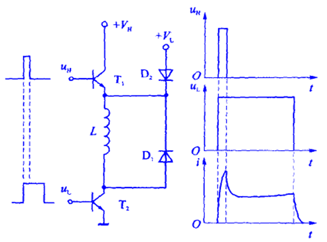 ![]() 雙電壓驅(qū)動(dòng)原理 特點(diǎn) 保證了低頻段仍然只有單電壓驅(qū)動(dòng)的特點(diǎn)。在高頻段具有良好的高頻性能,但仍沒(méi)擺脫單電壓驅(qū)動(dòng)的弱點(diǎn),限流電阻仍然會(huì)產(chǎn)生損耗和發(fā)熱。 2)高低壓法:不論電動(dòng)機(jī)工作頻率如何,在繞組通電開(kāi)始用高壓供電,使繞組中電流迅速上升,而后用低壓來(lái)維持繞組中的電流。 高低壓開(kāi)關(guān)脈沖同時(shí)起步,高壓脈沖很窄 開(kāi)始時(shí)T1T2同時(shí)導(dǎo)通, VH供電,i迅速上升VH很快關(guān)斷,VL繼續(xù)供電。