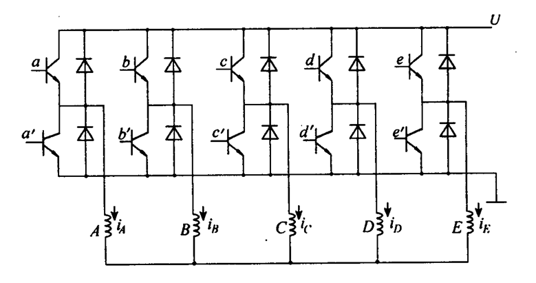 ![]() 使用H橋驅(qū)動(dòng),每相繞組必須用一個(gè)H橋。當(dāng)電機(jī)的相數(shù)較多時(shí),所用的開(kāi)關(guān)管較多,成本較高。為此,可采用多相橋式驅(qū)動(dòng)電路,使開(kāi)關(guān)管的數(shù)目減少一半。 2、五相橋驅(qū)動(dòng)五相混合式步進(jìn)電動(dòng)機(jī)