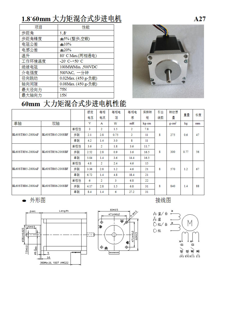 | 1.8°60mm兩相大力矩混合式步進電機 |